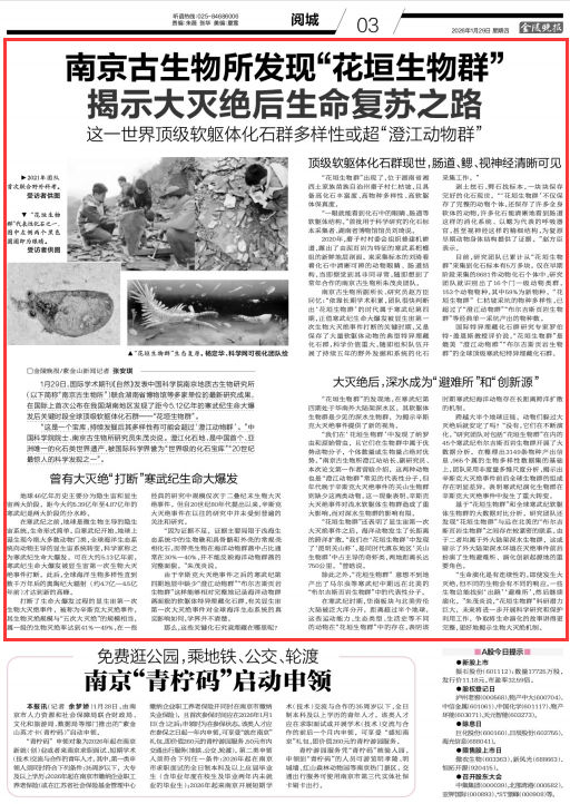 1月29日,国际学术期刊《自然》发表中国科学院南京地质古生物研究所(以下简称“南京古生物所”)联合湖南省博物馆等多家单位的最新研究成果,在国际上首次公布在我国湖南地区发现了距今5.12亿年的寒武纪生命大爆发后关键时段全球顶级软躯体化石群——“花垣生物群”。