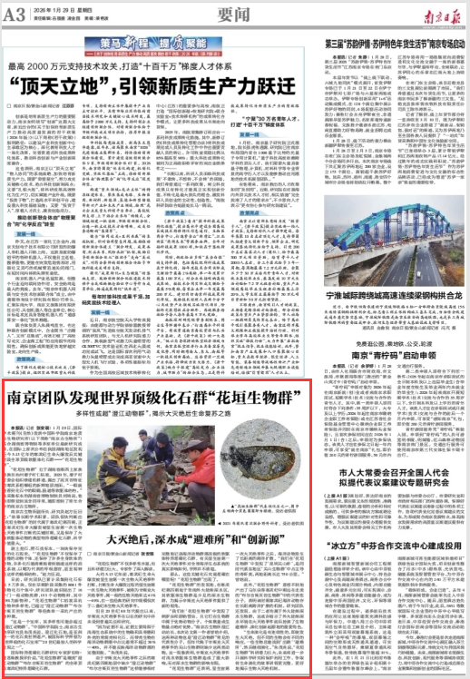 1月29日,国际学术期刊《自然》发表中国科学院南京地质古生物研究所(以下简称“南京古生物所”)联合湖南省博物馆等多家单位最新研究成果,在国际上首次公布在我国湖南地区发现距今5.13亿年的寒武纪生命大爆发后关键时段全球顶级软躯体化石群——“花垣生物群”。