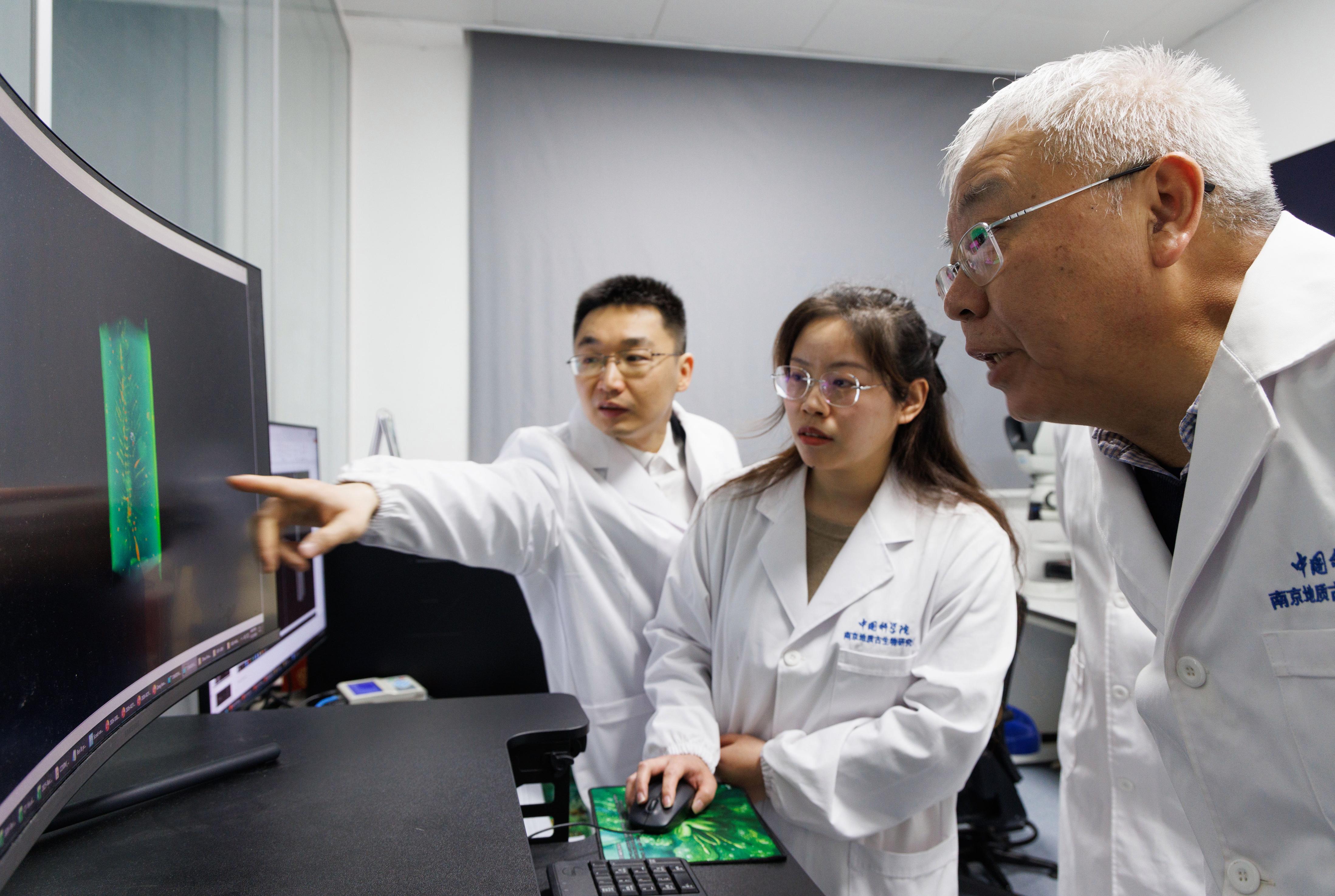 1月22日,在中国科学院南京地质古生物研究所显微CT实验室,中国科学院院士、研究员朱茂炎(右一),副研究员曾晗(左一)和同事观察扫描出来的化石图。新华社记者 金立旺 摄