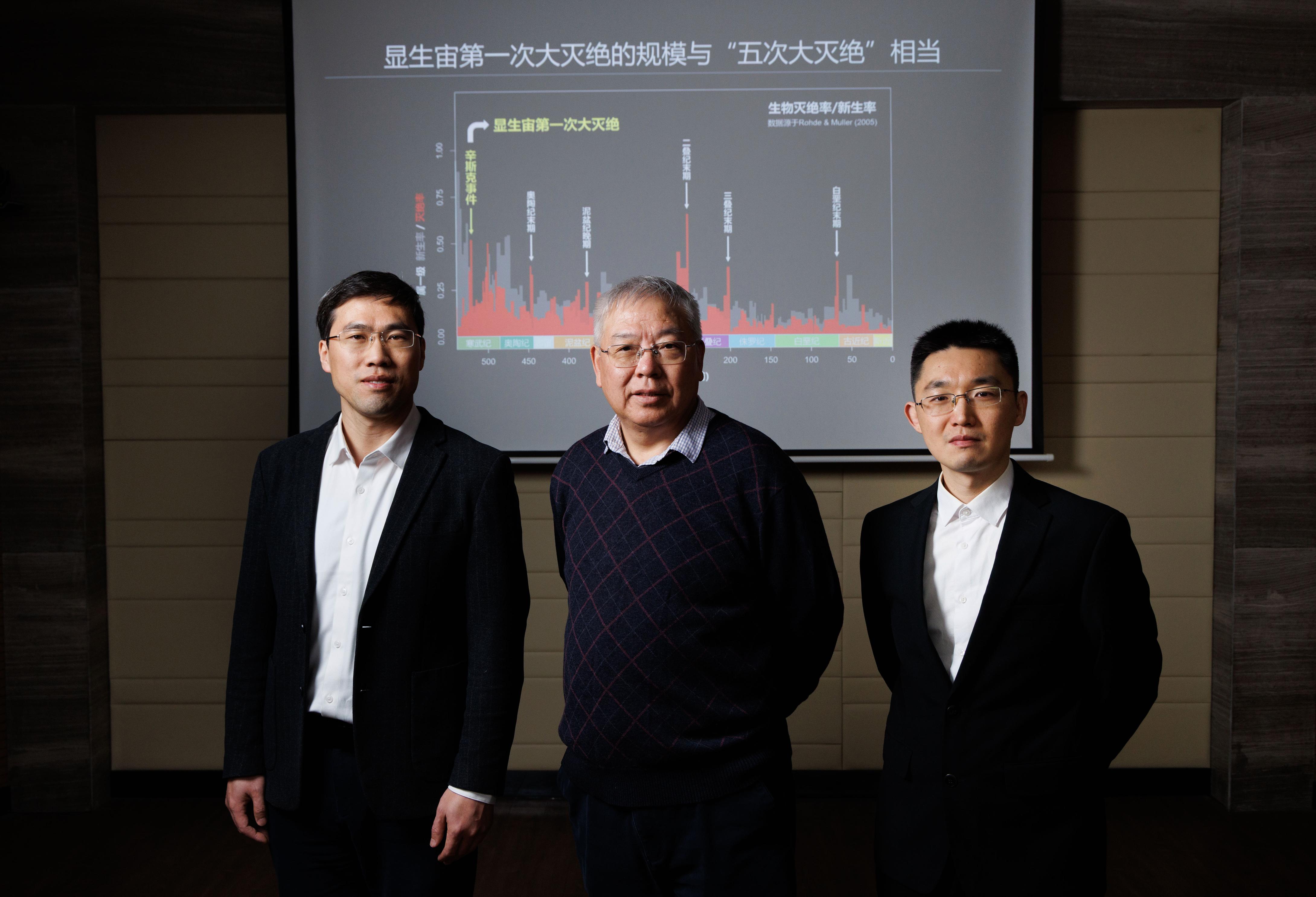 1月22日,在中国科学院南京地质古生物研究所实验室,团队部分成员:中国科学院院士、研究员朱茂炎(中),研究员赵方臣(左),副研究员曾晗(右)合影留念。新华社记者 金立旺 摄