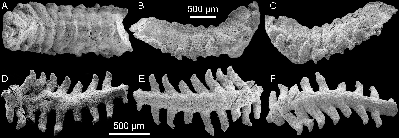 宽川铺生物群的环节动物. A–C, 短腿宽川铺虫, 正模标本; D–F, 长腿张家沟虫, 正模标本