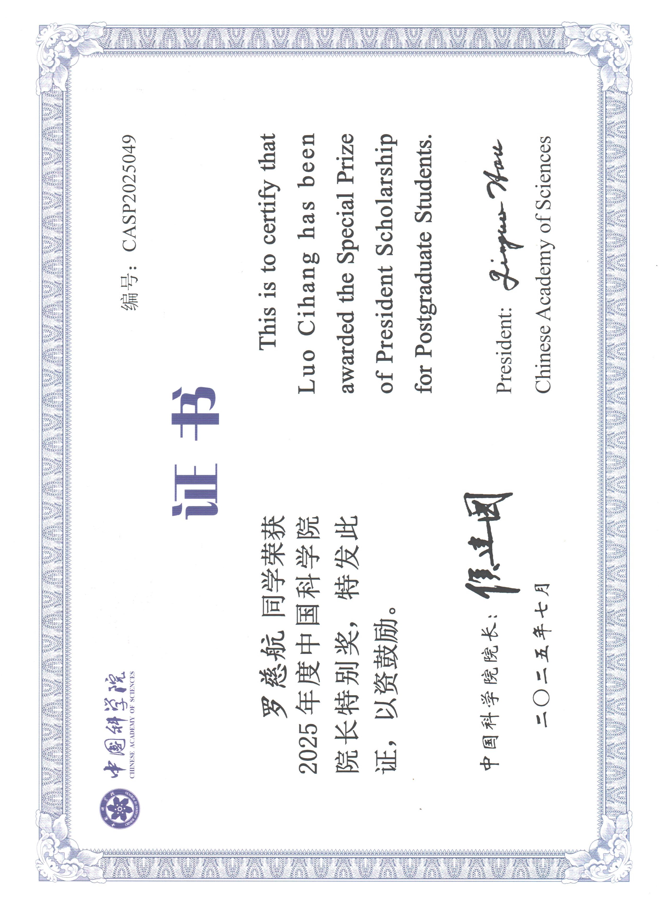 “中国科学院院长奖”设立于1989年,是中国科学院面向在学研究生的最高奖励,旨在激励研究生勤奋学习、创新进取,推动中国科学院率先建成人才培养高地,促进中国科学院科教事业发展。“中国科学院院长特别奖”是对中国科学院在学研究生的最高奖励,今年全院共80人获得该奖项。
