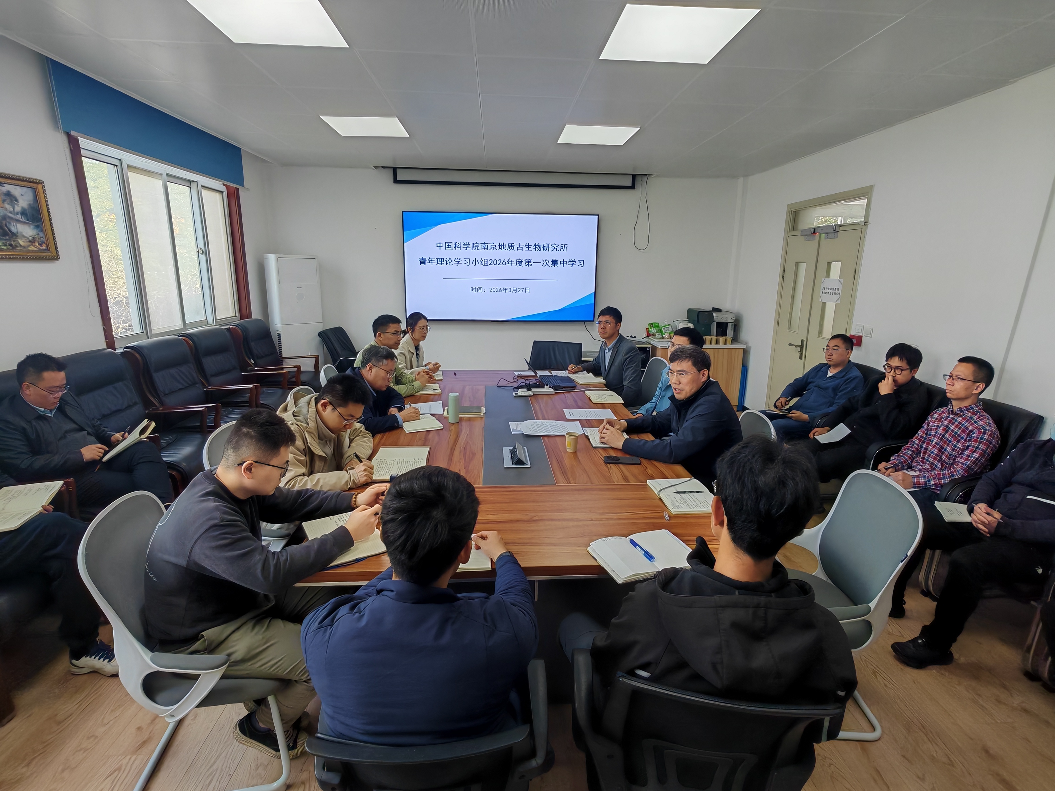 327日上午,中国科学院南京地质古生物研究所青年理论学习小组在实验楼二楼会议室召开2026年度第一次集中学习会。党委副书记(主持工作)、副所长赵方臣,党委副书记、纪委书记吕俊杰出席会议,青年理论学习小组全体成员参加。