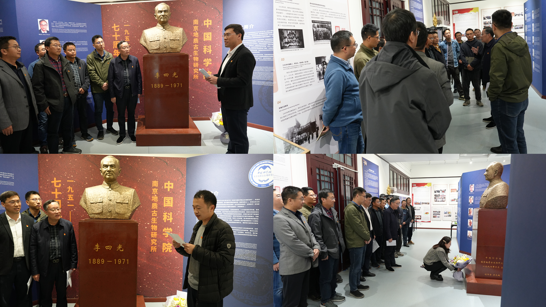 青年职工代表张俊鹏结合自身科研经历作交流发言。他表示,将以老一辈科学家为榜样,坚定理想信念,锤炼科研本领,在油气地层研究一线勇挑重担、攻坚克难,以实际行动践行新时代青年科研工作者的责任与担当。在庄重肃穆的氛围中,青年职工代表裴思嘉向李四光先生铜像敬献鲜花。全体人员肃立默哀,深切缅怀科学巨匠,表达对先辈的崇高敬意与无尽追思。